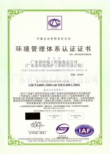 环境管理体系认证证书